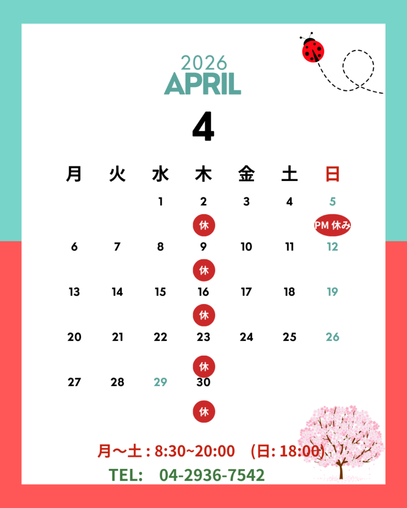 4/5(日)の午後は県外出張治療がありますので休診となります。午前中は予約を受け付けていますので、ご連絡お待ちしています。